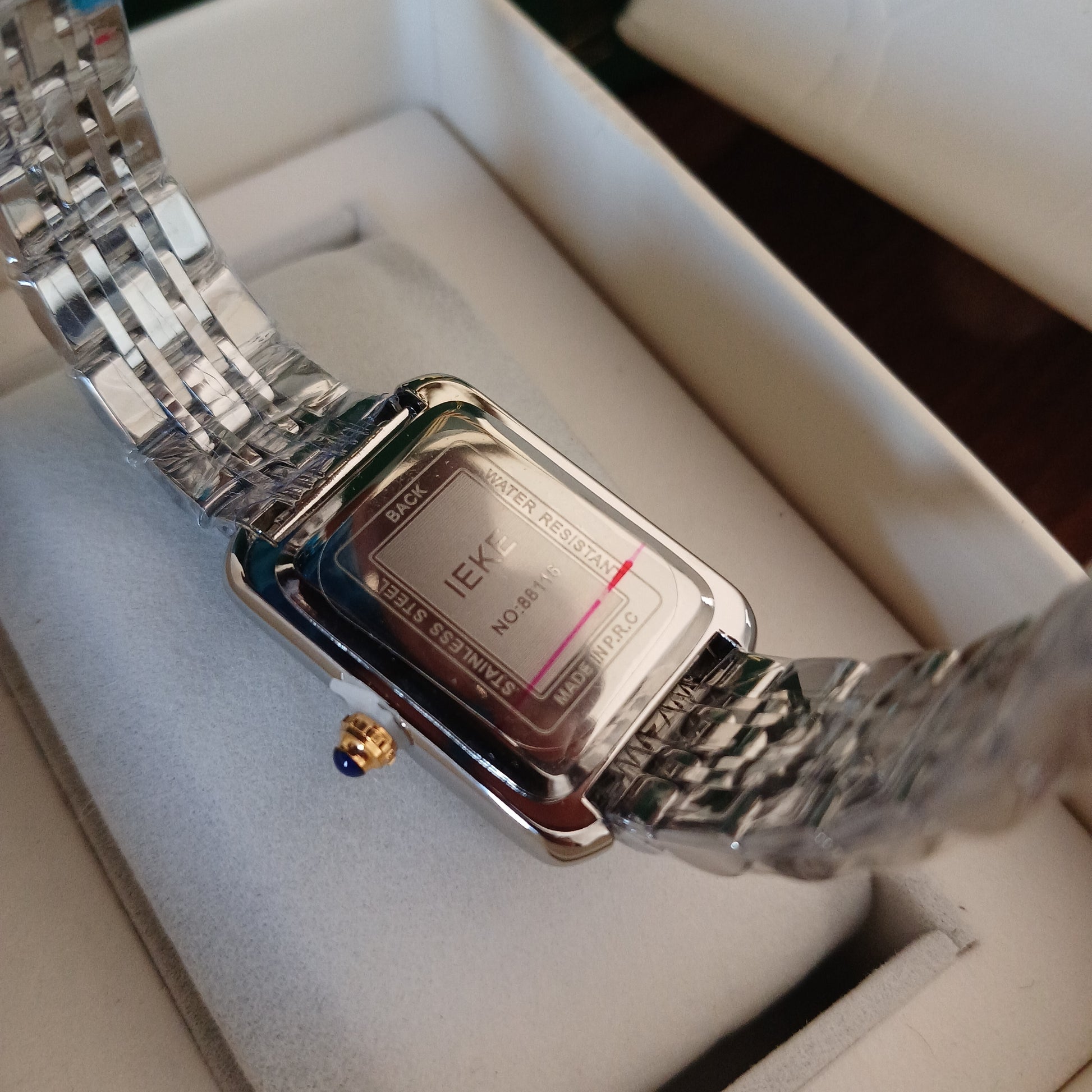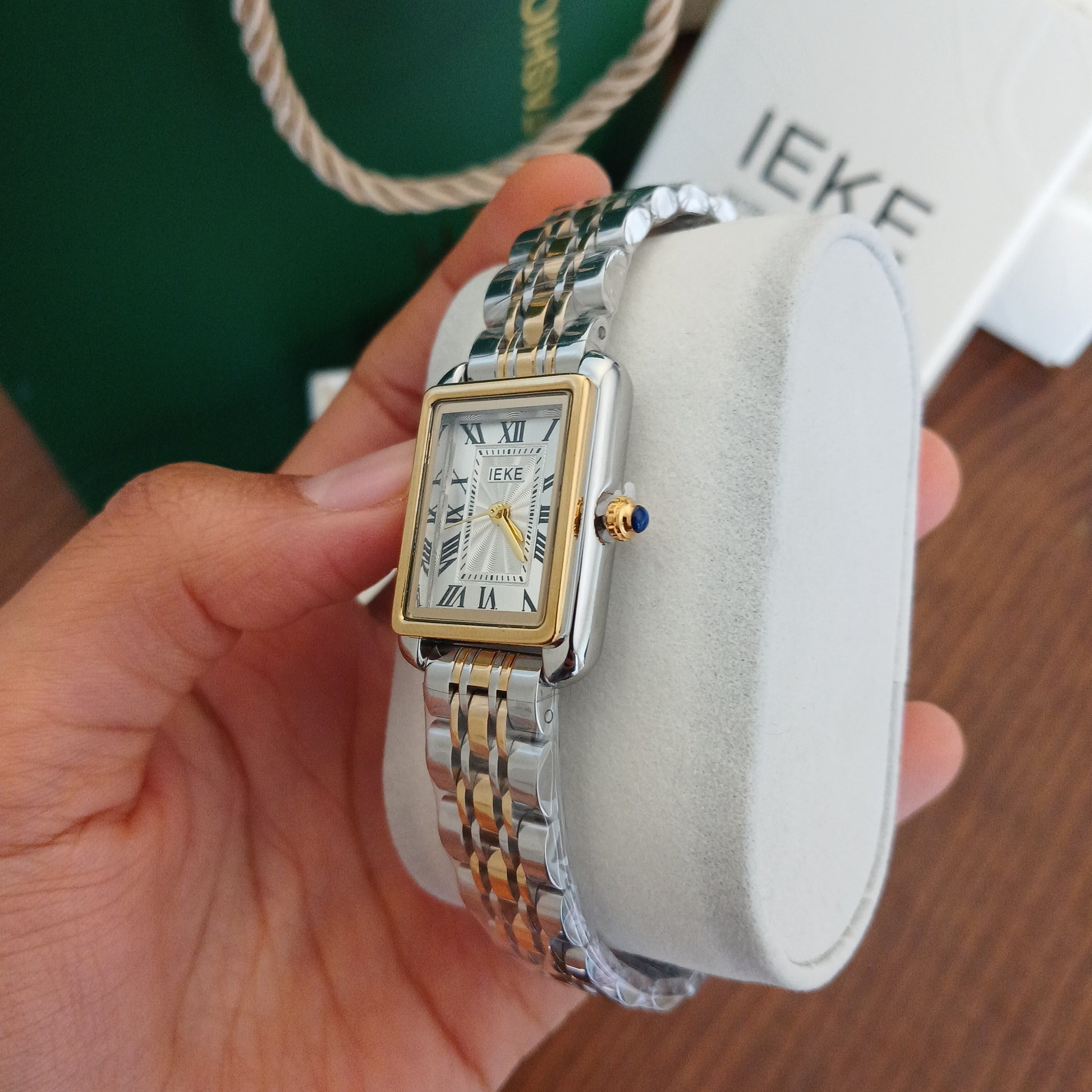 Cette montre IEKE combine l'élégance et la simplicité. Dotée d'un boitier rectangulaire de 22x30mm avec un cadran blanc et un bracelet bicolore en acier inoxydable.
